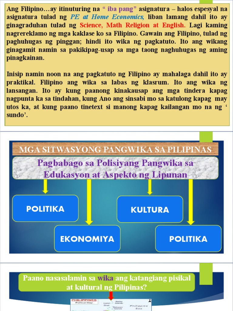 Gayunman sa kabila ng mga pagkakahawig ng mga wika sa Pilipinas malaki pa rin ang problema dahil sa kolonyal na karanasan ng bansa kung saan ang. Sitwasyong pangwika ng edukasyon sa ibat ibang disiplina. Sitwasyong Pangwika sa Edukasyon -Ang wikang ginagamit ay itinadhana ng K to 12 Basic Curriculum.