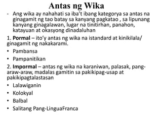 Pilosopo Tasyo Sisang Baliw King of Comedy Asias Song Bird Pnoy Pambansang Kamao Queen of all Media Fallen 44. Ang mga salita ay nag-iiba na ng kahulugan dahil sa mga memes at iba pang mga kaaliwan sa sosyal medya. Wika ang siyang dahilan kung bakit tayo ay nakakakuha ng mga mahahalagang impormasyon at kahulugan ng mga bagay bagay sa mundong itoMaaaring tungkol sa siyensamatematikapanlipunanat iba pa.